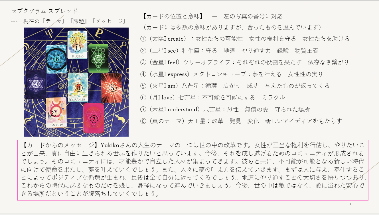 1人であれこれ考え先読みして空回りしがちな私にとって、セッションを受けることによって、考えをまとめたり、俯瞰できるのでありがたいです。カードからは、自分一人では見られない、多様な角度からアドバイスがもらえます。